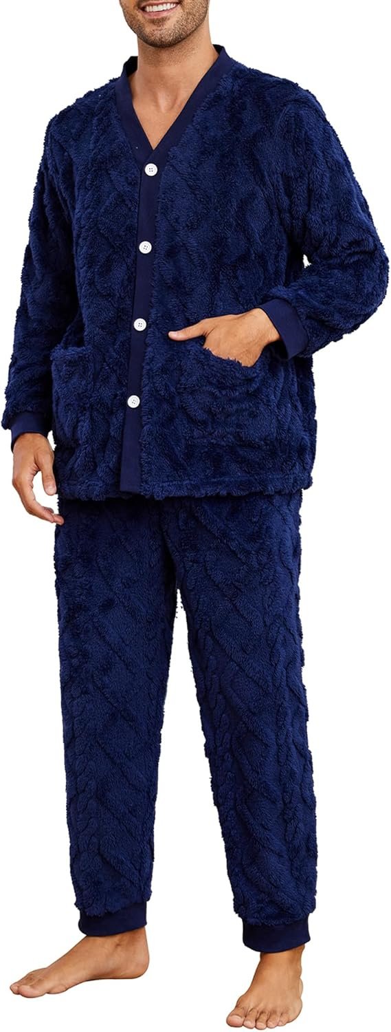 Mens Fleece Pajama Set Warm & No Bulky Notched Collar Long Sleeve Ultra Soft Sleepwear PJ Top & Bottom U20