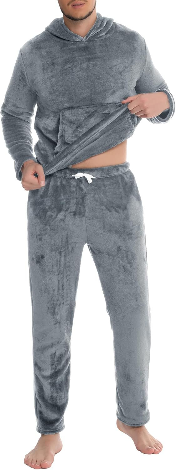 Mens Pyjamas Set, Warm & Soft Fleece Pj’s Sets for Men with Fluffy Hoodie Loungewear with Pockets